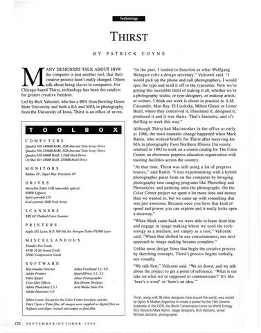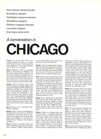 Nearly half of the feature CA articles about Chicago designers in this section were generously provided by Patrick Coyne, editor of Communication Arts magazine. A recent contribution by Phil Hamilton added sixteen others. Wayne Stuetzer and Joseph Essex provided more. Six of the video interviews of Chicago Designers were conducted in 1991 by Robert Even at Northern Illinois University with a grant from the NEA. Others were conducted by George Thompson at Columbia College Chicago.